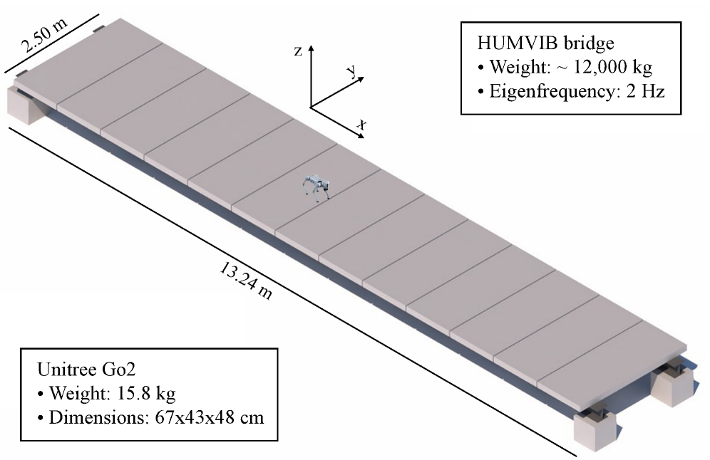 Немецкие исследователи из Дармштадтского технического университета разработали метод обучения четвероногого робота Unitree Go2 передвижению по нестабильным поверхностям. Робот тренировался на специальном мосту длиной 13.24 метра с собственной частотой колебаний 2.0 Гц, который имитирует условия землетрясений и других динамических возмущений почвы.