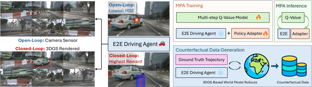 Причины ухудшения производительности замкнутого цикла в сквозном автономном вождении, включая несоответствия в наблюдениях и целевых установках. Справа: предлагается генерация контрафактных данных для решения проблемы несоответствия наблюдений и модель-ориентированная структура адаптации политики для устранения несоответствия целевых установок.