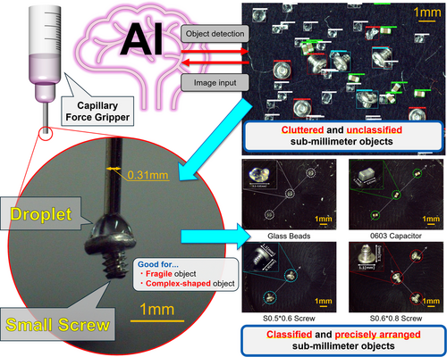 Японские ученые создали автономную систему, которая использует машинное обучение и капиллярные силы для автоматической сортировки объектов размером менее 1 мм. Система на базе YOLOv5 способна распознавать и перемещать сложные по форме детали с точностью позиционирования 157 ± 84 микрон, что открывает новые возможности для работы с микрокомпонентами в электронике и биомедицине.