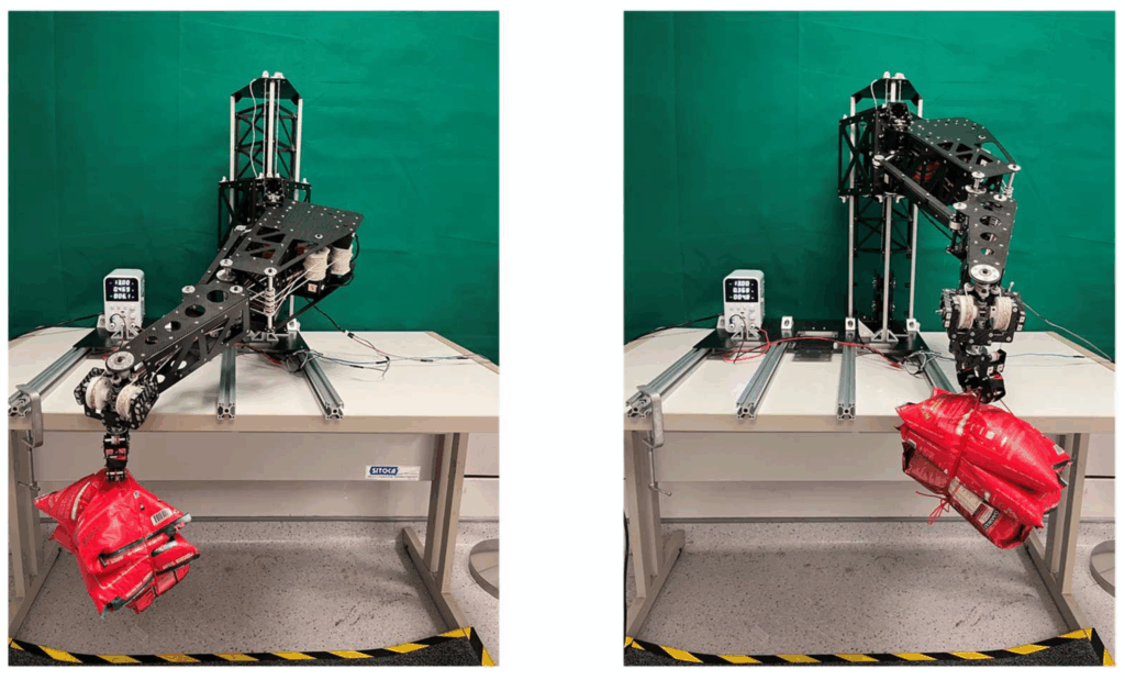 Тем не менее, общая ошибка повторяемости (с тремя стандартными отклонениями) составляет менее ±0.1 мм. С учетом количества моторов в плечевом суставе, конструкция модуля вертикального подъема обеспечивает преимущество в полезной нагрузке в 30 раз по сравнению с шарнирной рукой робота. При подъеме груза 3 кг пиковая мощность достигала 11.1 Вт на локтевом шарнире, что укладывается в номинал мотора ROBS-802 (17.6 Вт). Система использует механизм декаплинга в локтевом шарнире на основе Jiang, который поддерживает постоянное натяжение троса при движении суставов — это достигается комбинированием путей прокладки тросов, где изменения длины компенсируют друг друга.