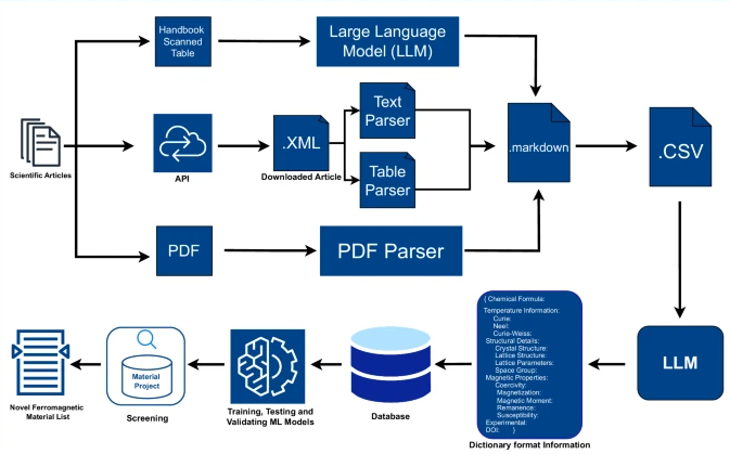 Научные статьи обрабатываются по трем направлениям в зависимости от их формата. Статьи, полученные через API журнала в формате XML, анализируются с помощью текстового и табличного парсеров. Стандартные PDF-документы обрабатываются PDF-парсером, который преобразует содержимое в текст формата markdown. Для старых, сканированных или основанных на изображениях PDF-файлов и исторических справочников используются возможности OCR Google Gemini для точного извлечения текста и таблиц. Для длинных документов, таких как справочники, содержимое обрабатывается постранично и преобразуется в формат markdown. Все выходные данные markdown затем конвертируются в файлы CSV. Эти файлы пропускаются через GPT-4o со структурированными промптами для извлечения соответствующих данных о материалах в единообразном формате JSON. После очистки и стандартизации извлеченной информации она компилируется в базу данных NEMAD. Курируемый набор данных используется для обучения моделей машинного обучения с целью классификации и прогнозирования температур Кюри и Нееля. Обученные модели затем применяются для скрининга высокоэффективных магнитных соединений.