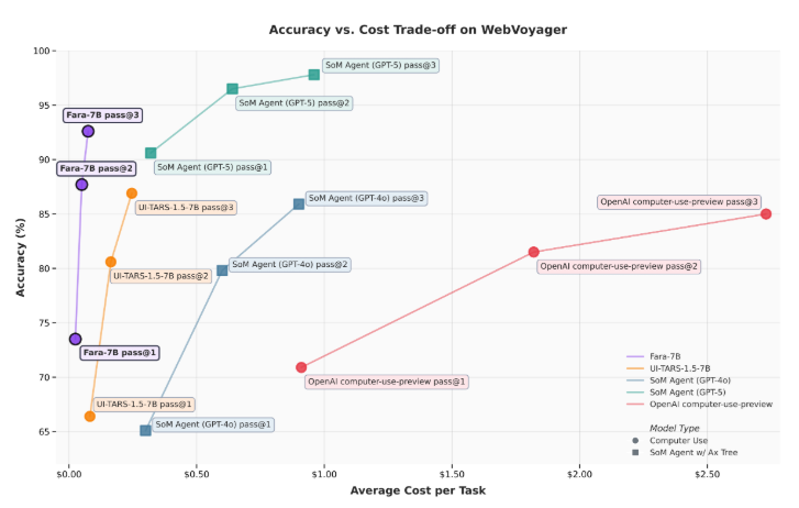 Fara-7B работает через визуальное восприятие веб-страниц и выполняет действия вроде скроллинга, ввода текста и кликов по предсказанным координатам. Модель не использует accessibility trees и взаимодействует с компьютером теми же способами, что и люди. Небольшой размер Fara-7B позволяет запускать ее непосредственно на устройствах, что снижает задержки и улучшает приватность.