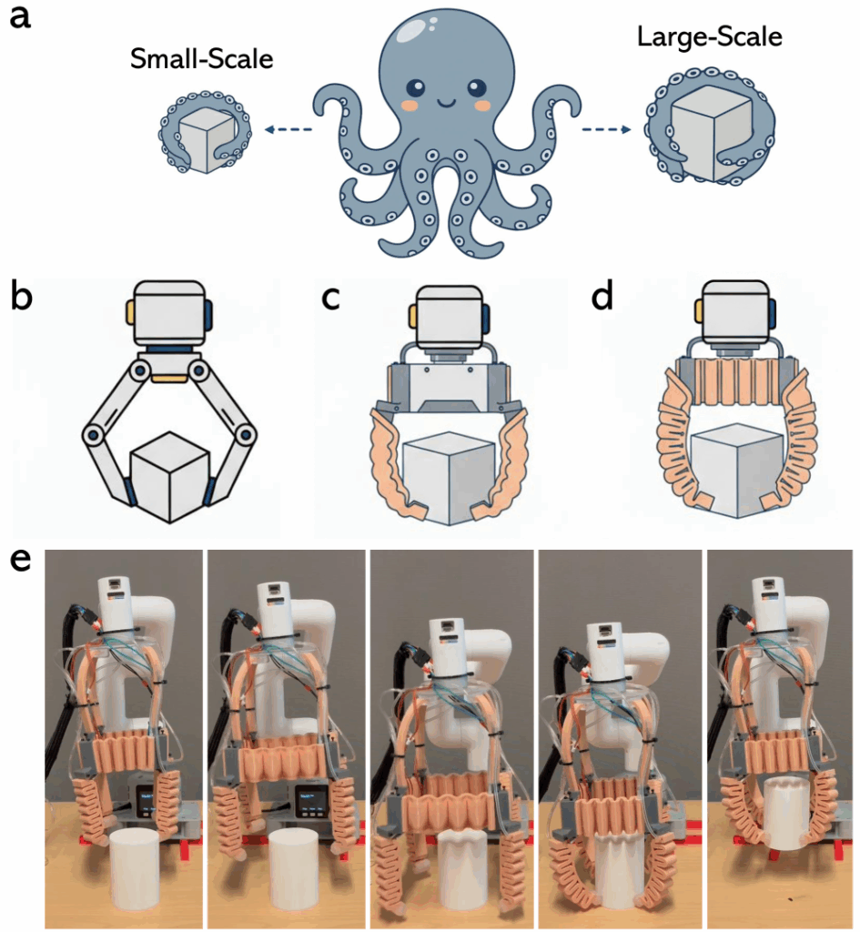 Инженеры создали мягкий захват, способный адаптивно перестраивать всю свою форму, что расширяет рабочий диапазон захвата и улучшает обобщение для различных геометрий объектов (стандартных и нерегулярных) и масштабов до 10×, а также открывает новые способы манипуляции, такие как многообъектный захват и захват внутренним крючком.