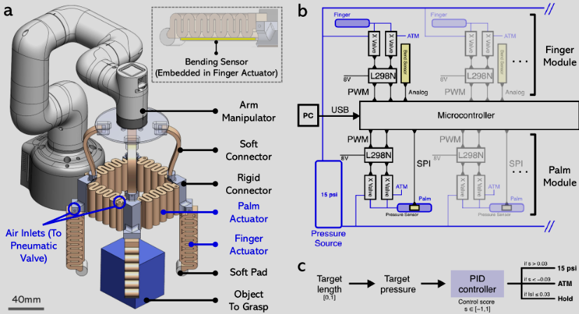 Ключевая особенность системы — интегрированная проприоцептивная обратная связь. Убрать это предложение, так как в оригинале эта информация отсутствует. Центральный микроконтроллер Raspberry Pi Pico управляет всеми контурами через восемь соленоидных клапанов. Стратегия захвата трехфазная: сначала захват раскрывается в дефолтную конфигурацию, затем актуаторы ладони перестраивают глобальную форму под масштаб объекта, и наконец пальцы надуваются до момента, когда датчики фиксируют контакт. Захват считается успешным, когда минимум три из четырех пальцев сообщают о контакте.