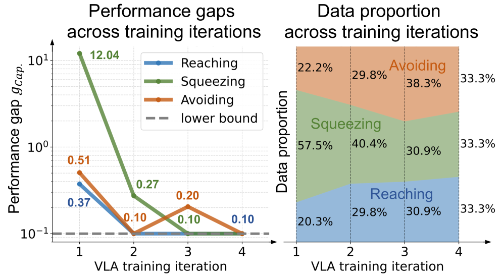 Ключевое нововведение — метод сбалансированной агрегации данных. Алгоритм автоматически определяет, какие навыки нужно подтянуть, и увеличивает долю соответствующих данных в обучающей выборке. Например, если модель плохо справляется с узкими проходами, система увеличит количество примеров от «squeezing-эксперта». В результате студент превзошел своих учителей — VLA-модель показала лучшие результаты, чем любой из отдельных RL-экспертов.