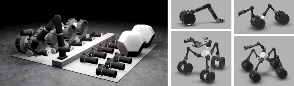 MoonBot — модульная роботизированная система, спроектированная для строительства лунной инфраструктуры при жестких ограничениях по массе полезной нагрузки. Робот состоит из функциональных модулей: Limb (манипулятор-нога), Wheel (колесная база), Body (центральный хаб) и Hand (захват). Система способна менять конфигурацию под задачу — от минимальной сборки из одного манипулятора и колеса до сложных форм с несколькими модулями.