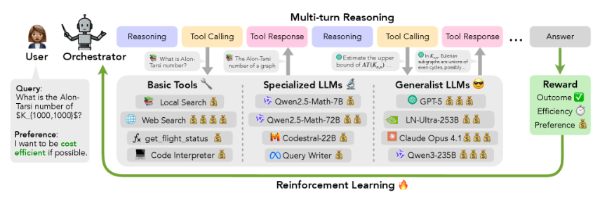 Большие языковые модели остаются дорогими в решении сложных агентных задач. Команда NVIDIA предложила парадигму оркестрации, где маленькая модель координирует специализированные инструменты и более мощные модели. Orchestrator динамически выбирает, какие инструменты вызывать, минимизируя стоимость и соблюдая пользовательские предпочтения.