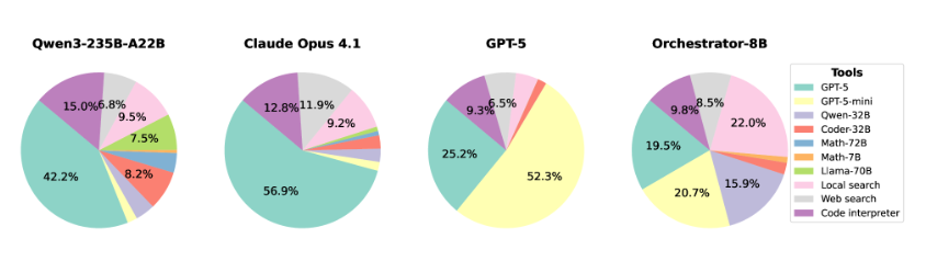 Доля вызовов инструментов, совершаемых LLM для решения задачи. Qwen-32B относится к Qwen3-32B, а Coder-32B — к Qwen2.5-Coder-32B-Instruct. По сравнению с другими сильными базовыми моделями, Orchestrator-8B совершает более сбалансированные вызовы инструментов и не демонстрирует сильной предвзятости в сторону какого-либо конкретного инструмента или модели.