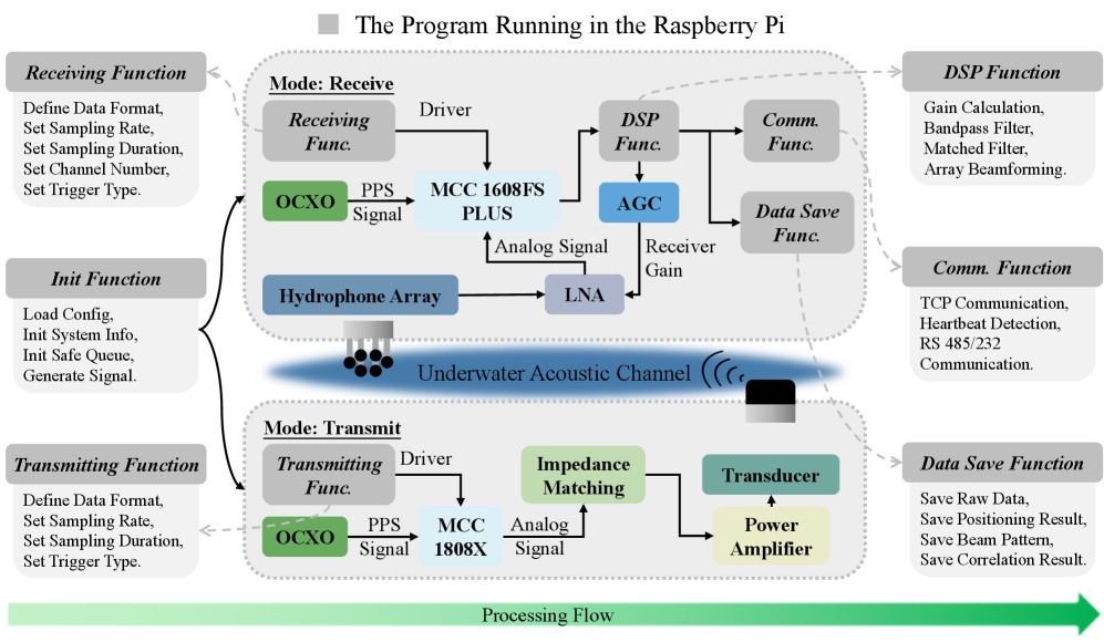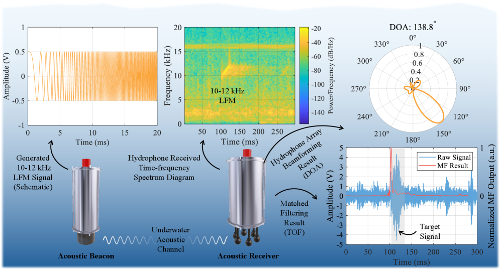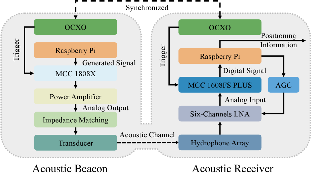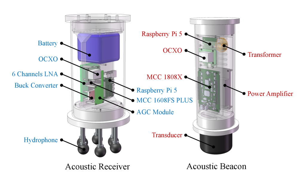 Система работает как подводный аналог GPS: маяк на поверхности отправляет звуковые сигналы, а приемник на роботе их ловит и вычисляет свое положение. Приемник объединяет массив из шести гидрофонов, многоканальный предусилитель, высокоточный термостабилизированный генератор OCXO, Raspberry Pi 5 и плату сбора данных MCC. Маяк устроен похоже: те же Pi 5, OCXO и плата MCC, плюс усилитель мощности и передающий преобразователь для отправки сигнала.
