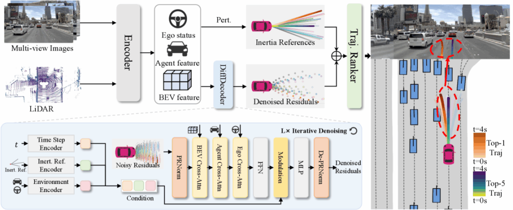 Для создания мультимодальных траекторий (то есть нескольких вариантов поведения) система использует возмущение инерциальной траектории — добавляет небольшой шум к начальной скорости автомобиля и генерирует 200 вариантов траекторий во время тестирования. Это как если бы водитель рассматривал разные сценарии: «а что если я поеду чуть левее/правее/быстрее». Затем специальный ранжировщик выбирает лучший вариант.