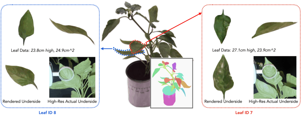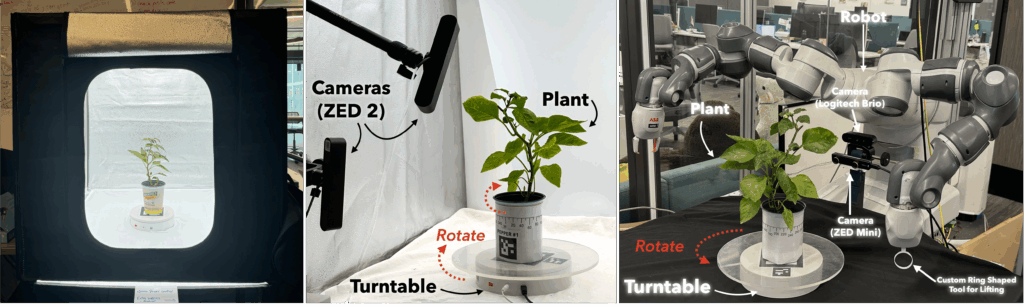 Система использует 4 камеры, цифровой поворотный стол и 7-степенной роботизированную руку для создания 3D-моделей с помощью Gaussian Splatting. В отличие от традиционных методов фенотипирования с фиксированными камерами, которые не могут увидеть детали из-за перекрытия листьями, Botany-Bot активно взаимодействует с растением. Робот может поднимать листья специальным кольцевым захватом, чтобы сфотографировать их нижнюю сторону в высоком разрешении — это критично для обнаружения вредителей и болезней.