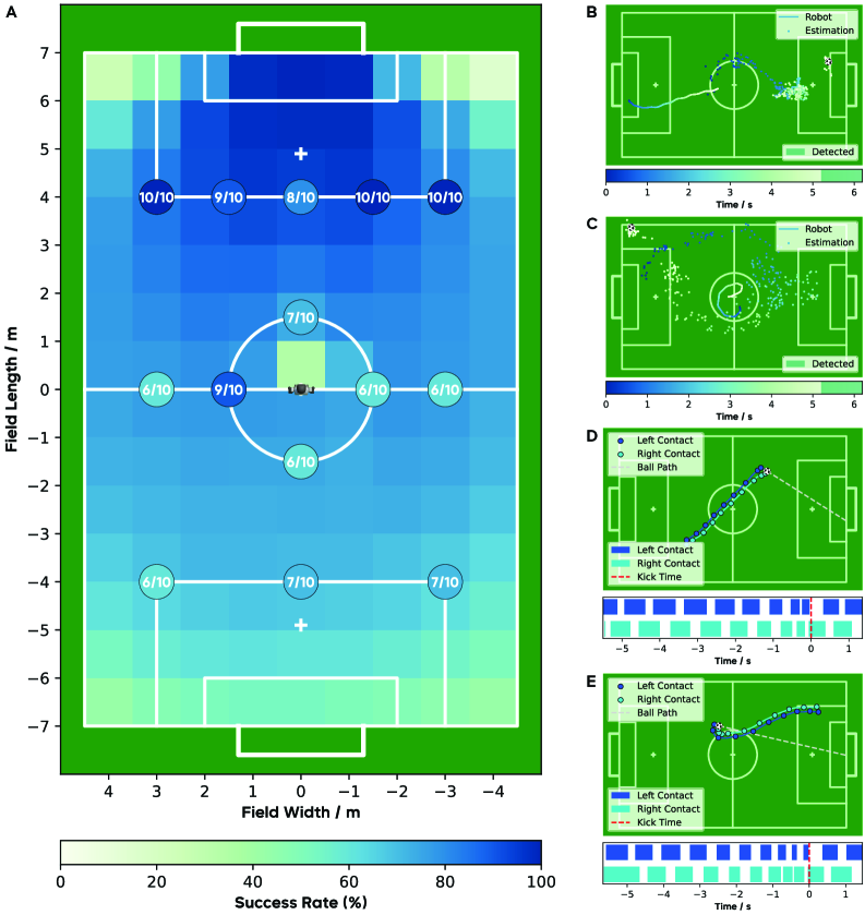 В симуляции робот успешно забивал мяч в ворота из большинства точек поля, причем успешность снижалась только на дальних дистанциях и при больших угловых отклонениях от направления на ворот (более ±10°). Реальные эксперименты показали результаты, сравнимые с симуляцией, без единого падения робота во всех тестах. Система снизила шум позиционирования мяча с 0.344 м до 0.186 м за последнюю секунду перед ударом — критичное улучшение, учитывая, что длина свода стопы робота всего 0.23 м. По сравнению с rule-based стратегией, которая требовала от 2 до 5 секунд в зависимости от ориентации робота, новый подход стабильно сокращал это время во всех направлениях, демонстрируя при этом более высокую угловую скорость поворота. Команда Tsinghua Hephaestus с этой системой выиграла Adult-size Humanoid League на RoboCup 2025 и World Humanoid Robot Games 2025, забив 76 голов и пропустив лишь 11.