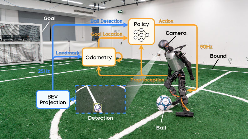 Представьте робота, который видит мяч, мгновенно оценивает ситуацию и бьет по воротам — все это за доли секунды, как человек. Исследователи создали систему управления для гуманоидных роботов, которая объединяет визуальное восприятие и контроль движений в единый процесс. Робот учится футбольным навыкам через обучение с подкреплением, имитируя человеческие движения и реагируя на мяч в реальном времени.