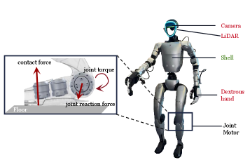 Иллюстрация критически важных компонентов гуманоидного робота. Модули восприятия и манипуляторы уязвимы к физическим ударам. В то же время руки, ноги и корпус служат защитными структурами, ослабляющими внешние воздействия, сохраняющими целостность встроенной электроники