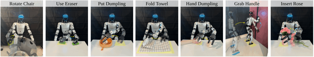 Для сбора данных использовались гуманоидные роботы Unitree G1 с 29 степенями свободы и H1 с 27 степенями свободы, оснащенные камерами Intel RealSense и LiDAR-системами Livox. Операторы управляли роботами через Apple Vision Pro, что позволило записывать естественные движения рук и пальцев. Команда переработала официальное ПО Unitree, снизив задержку управления с 500 мс до 2 мс и в два раза ускорив процесс сбора данных благодаря многопроцессорной архитектуре.
