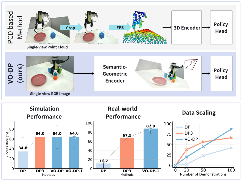 Исследователи из китайской компании D-Robotics и нескольких университетов представили VO-DP — метод обучения роботов-манипуляторов, который использует только RGB-изображения вместо дорогих датчиков глубины. Новый подход показал 87.9% успешности в реальных задачах, превзойдя метод DP3 на основе облаков точек (67.5%) и классический DP (11.2%).