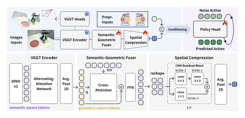 Алгоритм использует кросс-внимание для объединения семантической информации от DINOv2 и геометрических данных от блоков Alternating Attention. Затем CNN сжимает признаки в компактное представление сцены для диффузионной политики. Обучение проводилось на 8 NVIDIA A100 в течение 300 эпох.