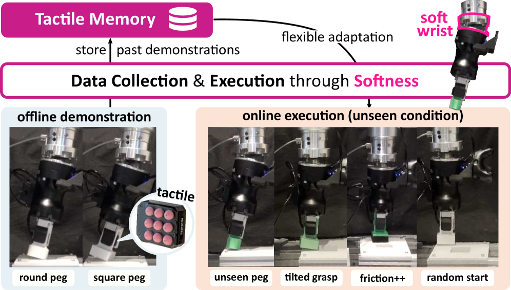 Инженеры из OMRON SINIC X создали TaMeSo-bot — робота с тактильной памятью и мягким запястьем для задач вставки деталей. Система достигла 85% успеха на незнакомых формах деталей, используя только тактильные датчики и силомоментные измерения. Мягкое запястье из трех пружин позволяет безопасно собирать данные при контакте, поглощая избыточные силы.