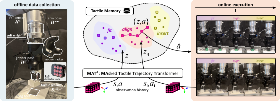 Ядро системы — Masked Tactile Trajectory Transformer (MAT³), который кодирует пространственно-временные взаимодействия между действиями робота и сигналами датчиков. Трансформер обучается через предсказание замаскированных токенов, восстанавливая пропущенные значения датчиков из соседнего контекста. Это заставляет модель фокусироваться на критических признаках контакта, автономно извлекая релевантную информацию без явной сегментации на подзадачи.