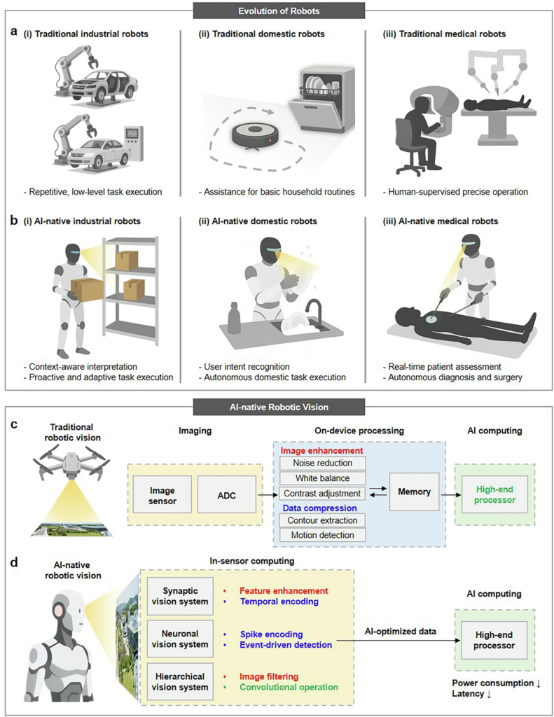 Схематическая иллюстрация традиционных роботов, работающих по заранее заданным инструкциям в структурированных средах: промышленные роботы, выполняющие повторяющиеся задачи низкого уровня (i), домашние роботы, помогающие в простых бытовых делах (ii), и медицинские роботы, служащие инструментами для операций под контролем человека (iii). b Схематическая иллюстрация AI-нативных роботов, обладающих подобной человеку автономностью для работы в неструктурированных средах: промышленные роботы, способные к контекстно-зависимой интерпретации и адаптивному выполнению задач (i), домашние роботы, распознающие намерения пользователя и автономно выполняющие домашние задачи (ii), и медицинские роботы, способные к оценке состояния пациента, диагностике и проведению операций в реальном времени с минимальным вмешательством человека (iii). c. Процессы обработки изображений и данных в традиционных системах машинного зрения роботов, где исходные изображения, захваченные сенсорами, проходят несколько этапов предварительной обработки перед передачей на внешние высокопроизводительные процессоры для выполнения AI-выводов. d. Оптимизированный процесс обработки изображений и данных в AI-нативных системах машинного зрения роботов, где синаптические, нейронные и иерархические системы зрения генерируют оптимизированные для AI данные, пригодные для выполнения AI-выводов.